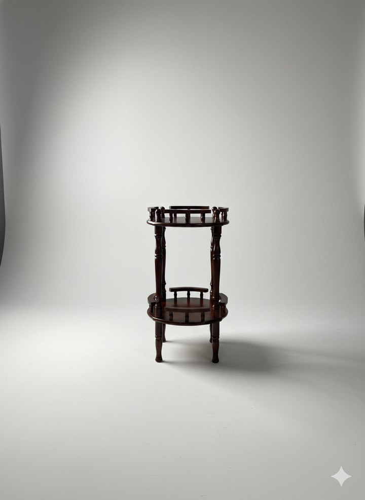 Give your décor a refined lift with the Aali Corner Stand. Designed with two rounded tiers and elegant turned legs, this compact stand fits neatly into any corner or beside a sofa or chair. The upper and lower shelves feature decorative railings that help keep your display items secure, while the rich dark-wood finish adds a warm, classic feel to any room.