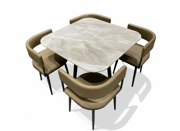 Bring contemporary style and comfort to your dining space with the Amora Modern Dining Set. Designed with a sleek square dining table featuring a premium marble-textured top, this set blends elegance with everyday functionality. The set includes four ergonomically designed chairs upholstered in soft, durable leatherette with cushioned seating that ensures a relaxed dining experience.
