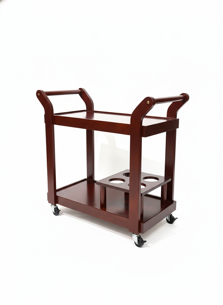 Serve in style with the Catarina Trolley, a sleek two-tier wooden cart designed for effortless entertaining. Finished in a rich warm brown, it features raised side handles for easy maneuvering, smooth 360° caster wheels, and spacious upper and lower shelves for dishes, snacks, or barware. The integrated bottle holder keeps up to four bottles secure and upright while you move, making it perfect for use as a bar cart, tea trolley, or utility cart in dining rooms, restaurants, or home gatherings.