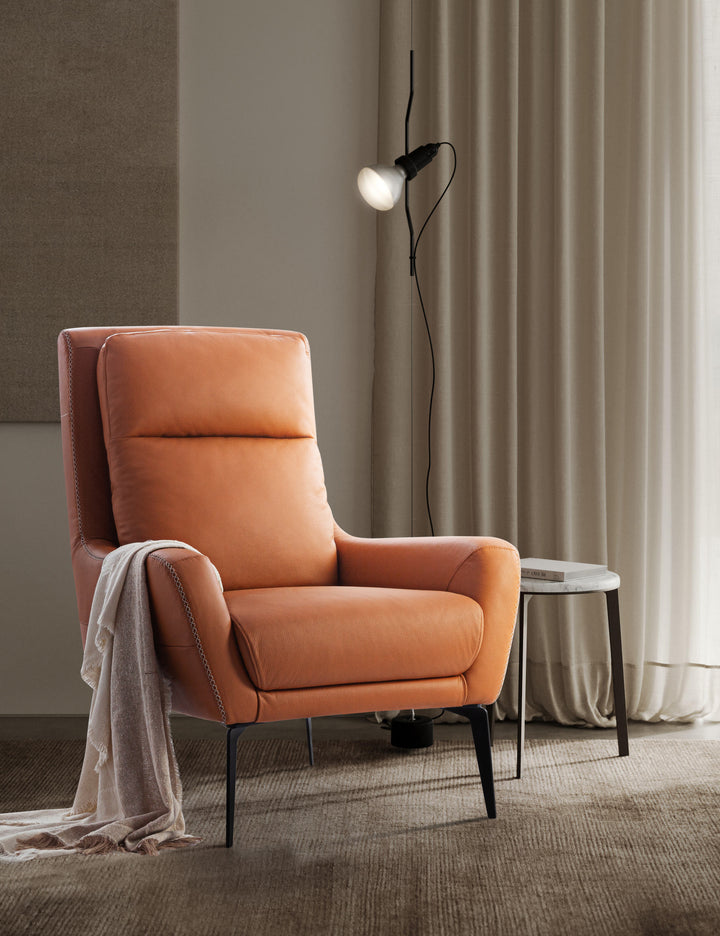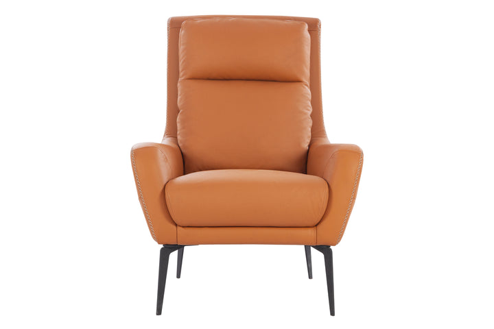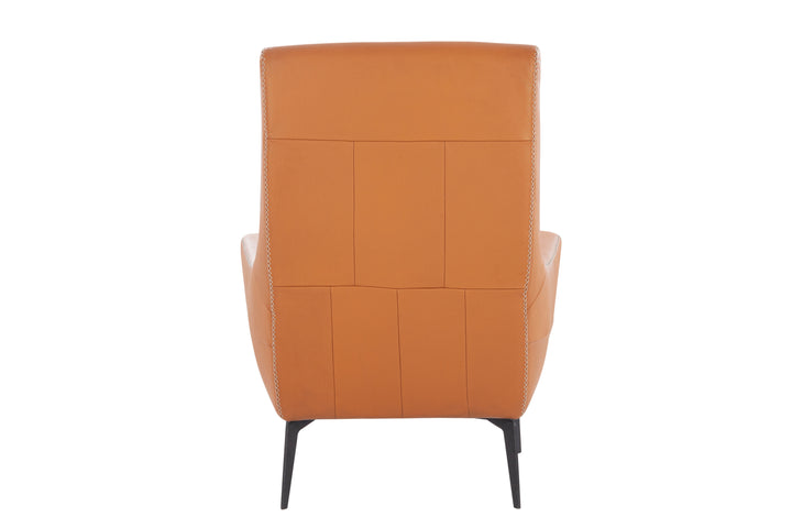 Experience modern comfort with this premium high-back lounge chair, crafted in rich tan leather for a warm and sophisticated look. Its ergonomic silhouette provides exceptional lumbar and shoulder support, making it perfect for long hours of reading or relaxing. The hand-stitched contrast piping elevates its aesthetic, adding a touch of craftsmanship to every curve. Soft-touch cushioning and a generously padded seat ensure a plush sitting experience. Supported by sleek, powder-coated metal legs, the chair balances elegance with long-lasting durability. Ideal for living rooms, bedrooms, and stylish corners, this chair enhances any interior with timeless luxury.