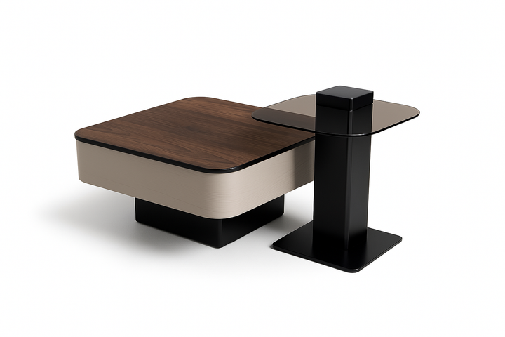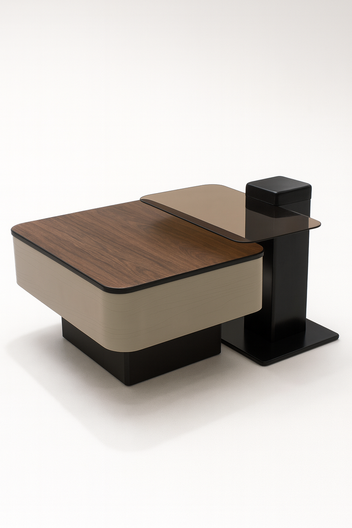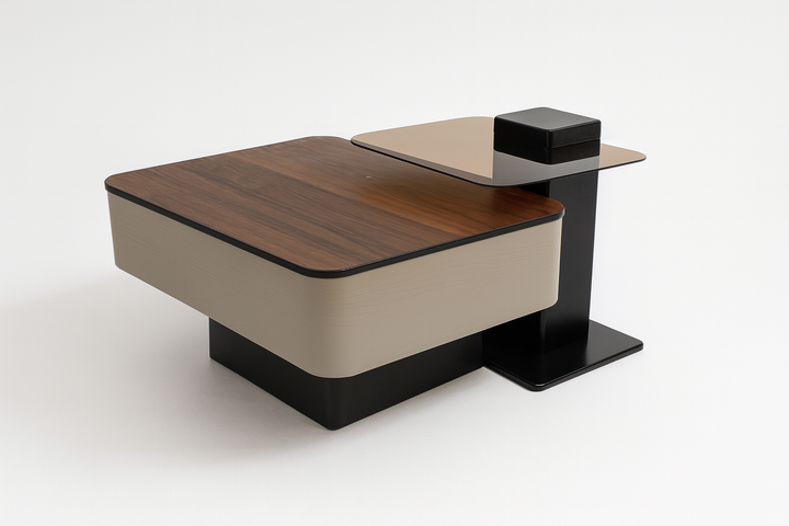 Redefine your living room with this contemporary dual-layer coffee table set featuring a perfect blend of wood, glass, and matte-finished structure. The main table comes with a rich wooden top and a sleek beige body, while the elevated side table features a smoked-glass top supported by a bold black pedestal base. Together, they create a sophisticated, layered look that stands out in any modern home.