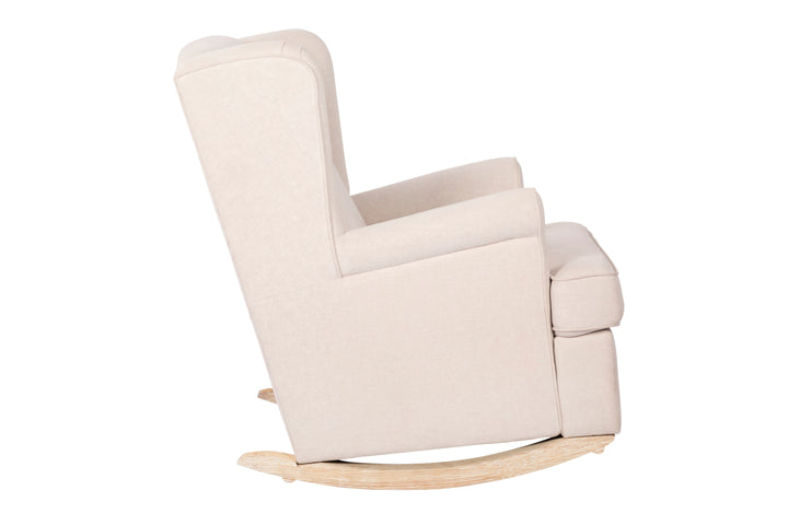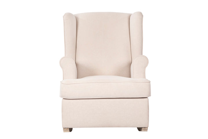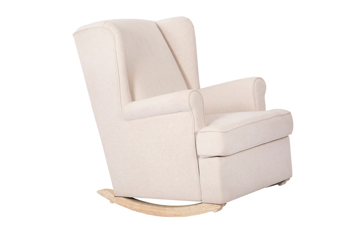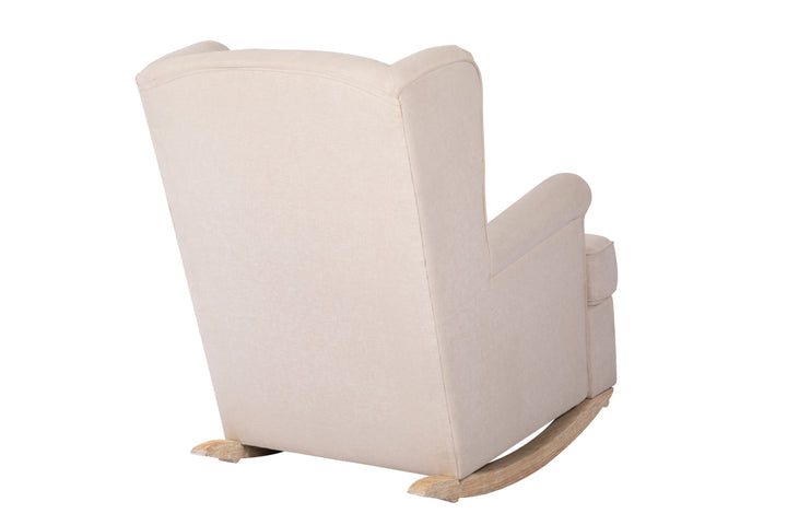 Bring timeless comfort and graceful motion into your home with this elegant cream-colored rocking armchair, designed to blend effortlessly with modern, classic, and minimal interiors. Upholstered in soft, premium fabric, the chair features a high wingback silhouette and gently curved armrests that deliver full-body support. The plush, well-padded seat ensures exceptional comfort, while the smooth wooden rocker base provides a soothing back-and-forth motion perfect for relaxing, reading, or unwinding after a long day. Its neutral tone and refined shape make it an ideal addition to living rooms, bedrooms, nurseries, or cozy corners.
