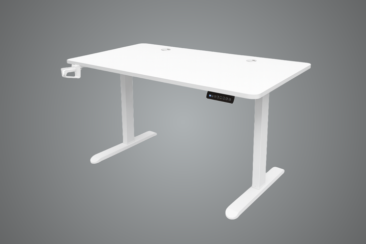 Upgrade your workspace with the sleek MANTIS 140x70 motorized height-adjustable table in crisp white. Designed for modern offices and home setups, this spacious 140x70 cm desktop offers plenty of room for dual monitors, laptops, and paperwork, while keeping your space clean with integrated cable grommets.
