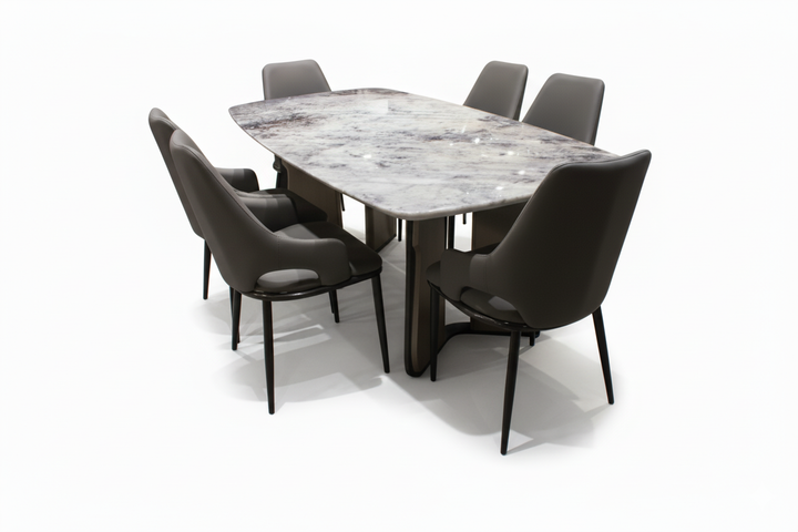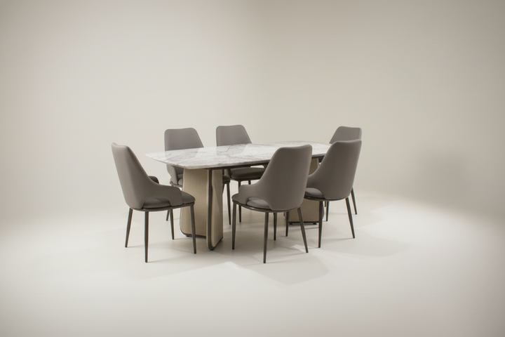 This luxurious 6-seater dining set is crafted to add a sophisticated and modern touch to your dining space. Featuring a stunning premium marble-finish tabletop, the table highlights beautiful natural stone patterns, delivering an elegant and upscale look. The smooth, durable surface is easy to clean and designed to withstand daily use, making it ideal for both family meals and stylish gatherings.