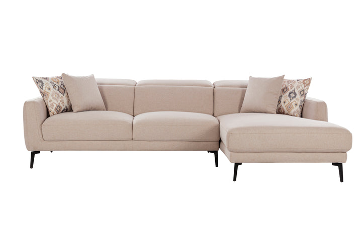 The L-shape layout with an extended chaise provides ample space for lounging, stretching out, or hosting guests. Adjustable headrests add an extra layer of comfort, allowing you to relax in your preferred position. Supported by sturdy metal legs, this sofa ensures stability and long-lasting durability.