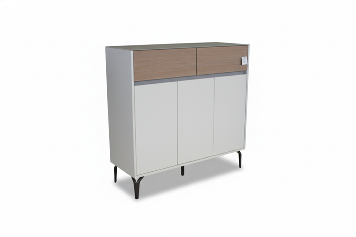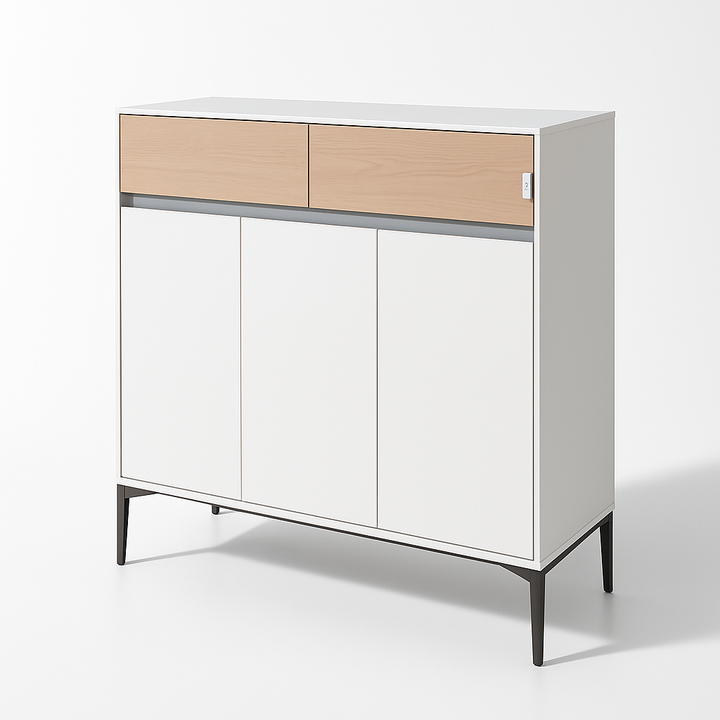 Bring sleek organization to your entryway with the SKRILL Shoe Rack. This modern cabinet features three spacious doors for neatly storing shoes and two top drawers for essentials like keys, socks, or polish. The clean white body is accented with a light wood drawer front and slim dark line detail, giving it a contemporary, Scandinavian-inspired look. Elevated metal legs provide stability and make cleaning underneath easy. Perfect for hallways, bedrooms, or dressing areas where you want clutter-free style and smart storage in one compact unit.