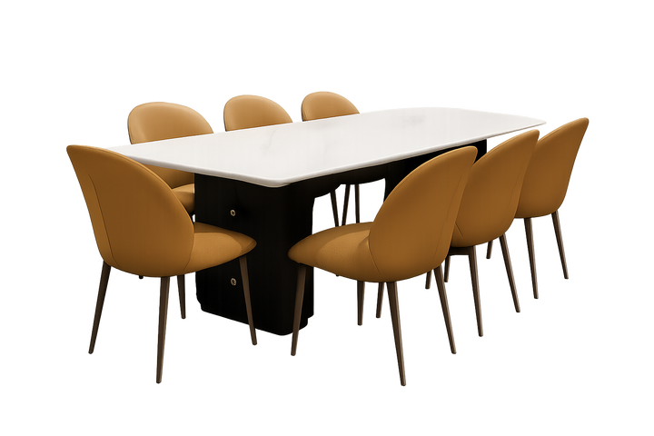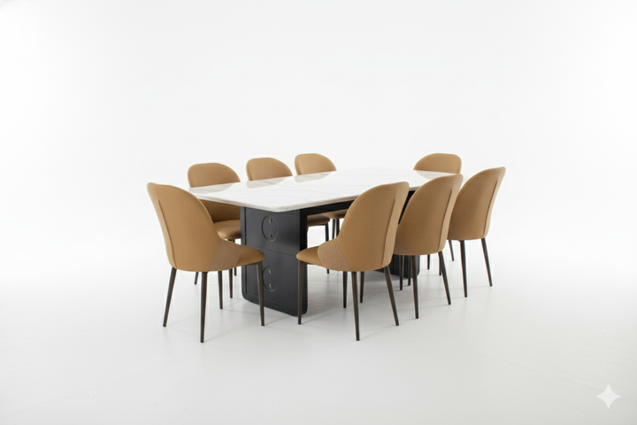 This premium 8-seater dining set is designed to make a bold statement in any modern home. Featuring a spacious rectangular marble-finish tabletop, it offers a luxurious, polished surface that showcases elegant natural veining. The durable top is resistant to stains and scratches, making it perfect for everyday family meals as well as large gatherings.