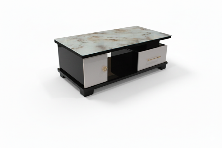 Premium Glass-Top Coffee Table with Dual Storage Drawers Upgrade your living room with this stylish and functional coffee table featuring a luxurious glass marble-finish top and a sleek black-and-white body. The...